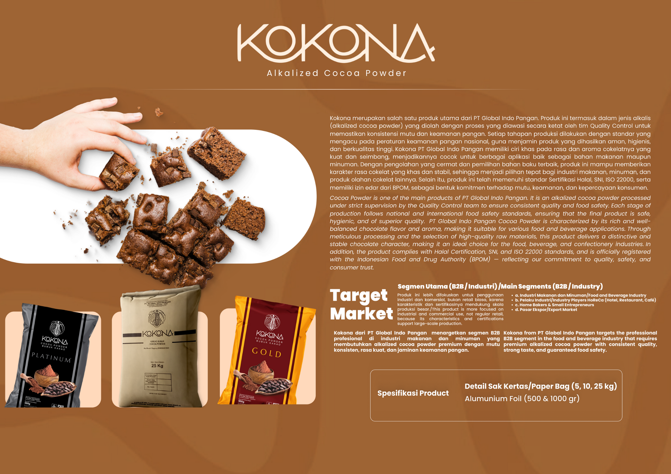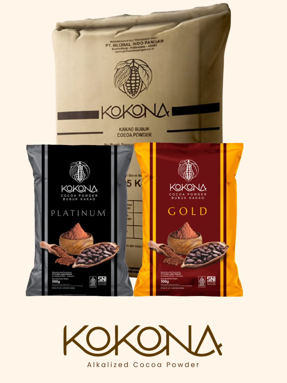 Kokona termasuk dalam jenis alkalis (Alcalized Cocoa Powder) yang diolah dengan standar kualitas tinggi sehingga memberikan karakter rasa cokelat yang khas dan stabil.