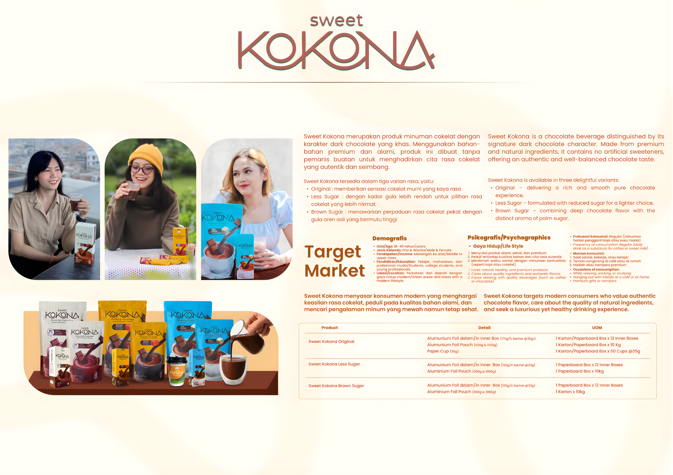 Sweet Kokona merupakan produk minuman cokelat dengan karakter dark chocolate yang khas menggunakan bahan premium dan alami, dibuat tanpa pemanis buatan untuk menghadirkan cita rasa cokelat yang autentik dan seimbang.