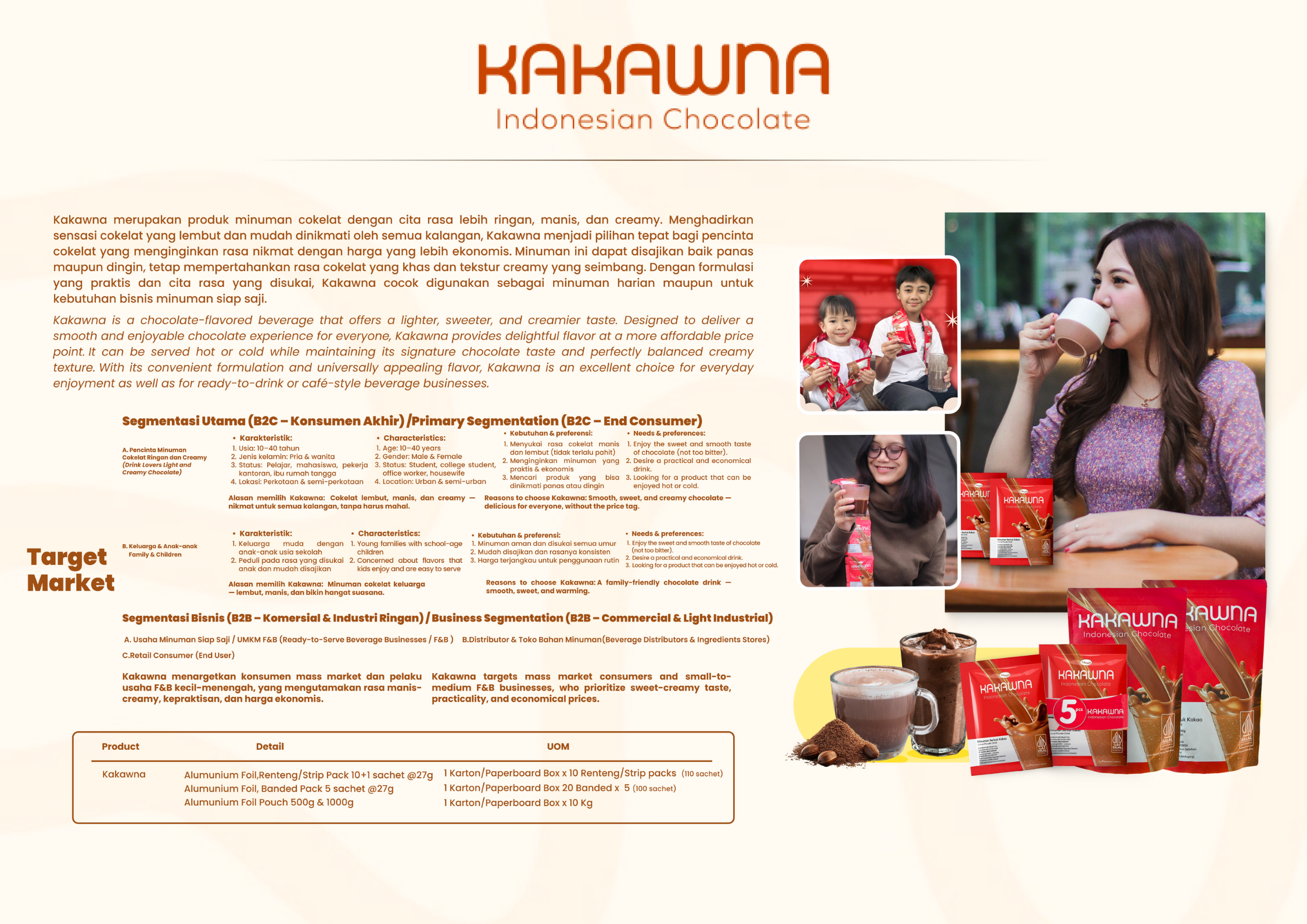 Kakawna merupakan produk minuman cokelat dengan cita rasa lebih ringan, manis, dan creamy. Menghadirkan sensasi cokelat yang lembut dan mudah dinikmati oleh semua kalangan.